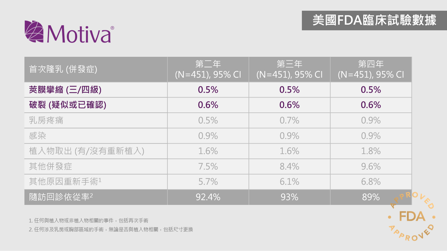 Motiva 美國醫療器材臨床試驗 (IDE) 研究在美國的 32 個中心和西歐的 3 個中心進行。在植入後三年的研究終點,初次隆乳群組的病人回診依從率超過 92%。該群組(N=451)的患者(95% 信賴區間)三年內首次出現併發症的 Kaplan-Meier 風險率如下:莢膜攣縮: 0.5% ;確認或疑似破裂: 0.6% (MRI 群組 N=176);乳房疼痛: 0.7% ;感染: 0.9% 。任何再手術,包括植入物尺寸更換的情況,報告率為 6.1% ,任何併發症,包括再手術,報告率為 8.4% 。